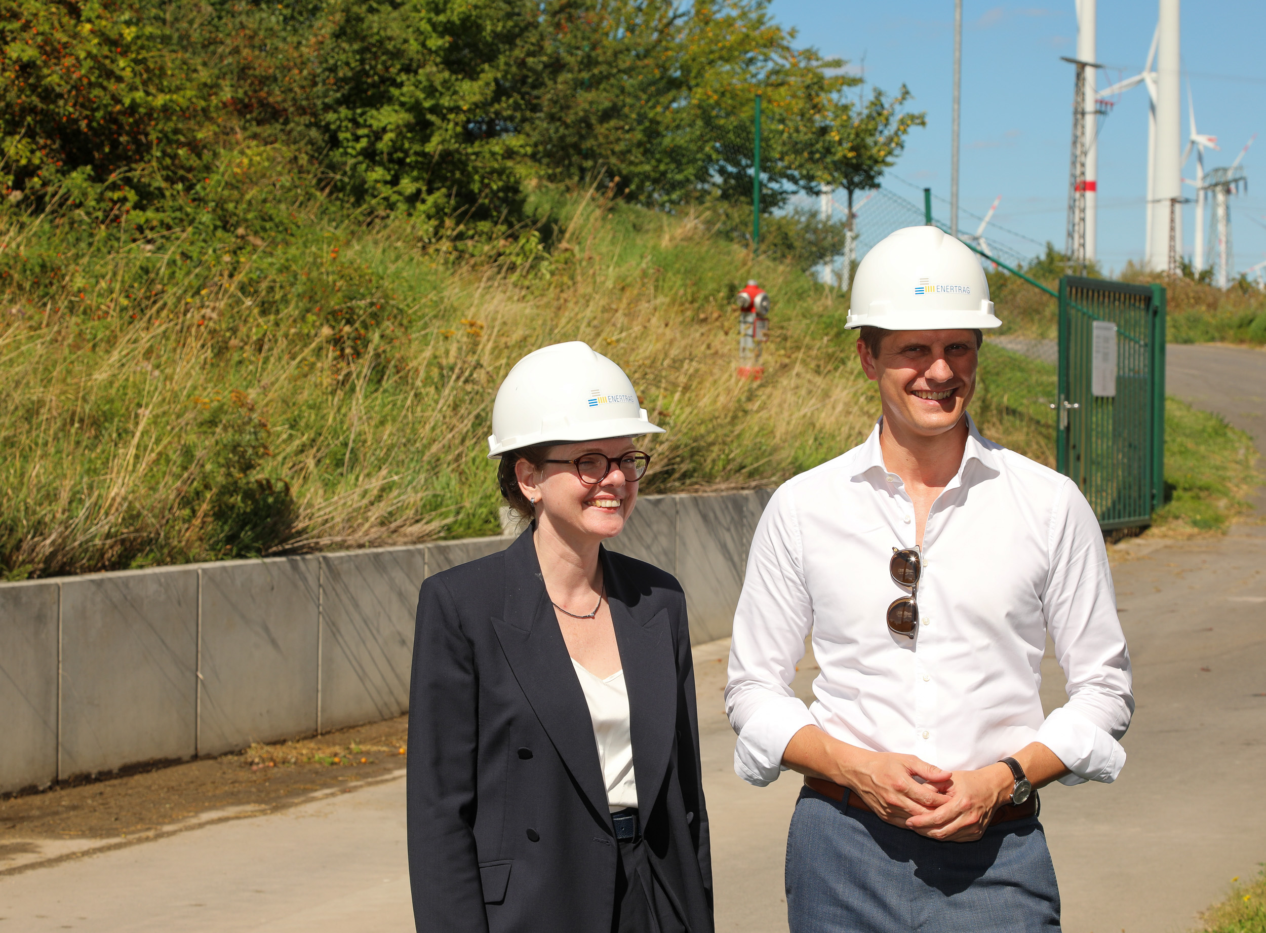 Enertrag präsentierte praxisnahe Ansätze, mit denen die Energiewende gestaltet und die Versorgungssicherheit gestärkt wird – von der Echtzeitüberwachung von Wind- und Hybridkraftwerken über die Entwicklung digitaler Plattformen bis hin zum Einsatz von Künstlicher Intelligenz zur Optimierung der Energieerzeugung. Besonderes Interesse zeigte Grimm am Verbundkraftwerk in der Uckermark, das mit 610 Megawatt Windenergie, Biogas, Batterien und über 600 Kilometern Kabelnetz vollständig digital gesteuert wird. „Das Verbundkraftwerk von Enertrag zeigt eindrucksvoll, wie Digitalisierung und erneuerbare Energien Hand in Hand gehen können. Intelligente Steuerungssysteme, grüne Wasserstofftechnologie und vernetzte Energiespeicher machen hier bereits heute möglich, was viele für die Zukunft fordern“, sagte Grimm. Dauerthal sei ein starkes Beispiel für technologische Innovationskraft im ländlichen Raum.